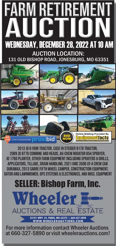 FARM RETIREMENT AUCTION WEDNESDAY, DECEMBER 28, 2022 AT 10 AM AUCTION LOCATION: 131 OLD BISHOP ROAD, JONESBURG, MO 63351 BID LIVE UD Online Bidding Provided By BID NOW Equipmentfacts proxibid 2013 JD 6190R TRACTOR, CASE IH STEIGER 9170 TRACTOR, 2009 JD 9770 COMBINE AND HEADS, AG-CHEM ROGATOR 854 SPRAYER, JD 1780 PLANTER, OTHER FARM EQUIPMENT INCLUDING SPRAYERS & DRILLS, APPLICATORS, TILLAGE, GRAIN HANDLING, 2021 GMC 3500 AT-4 CREW CAB DURAMAX, 2013 SABRE FIFTH WHEEL CAMPER, CONSTRUCTION EQUIPMENT, GATOR AND LAWNMOWER, GPS SYSTEMS & ELECTRONICS, AND MISC. EQUIPMENT SELLER: Bishop Farm, Inc. Wheeler AUCTIONS & REAL ESTATE 23101 HWY. 24, PARIS, MO 65275 | 660-327-5890 WWW.WHEELERAUCTIONS.COM For more information contact Wheeler Auctions at 660-327-5890 or visit wheelerauctions.com! FARM RETIREMENT AUCTION WEDNESDAY , DECEMBER 28 , 2022 AT 10 AM AUCTION LOCATION : 131 OLD BISHOP ROAD , JONESBURG , MO 63351 BID LIVE UD Online Bidding Provided By BID NOW Equipmentfacts proxibid 2013 JD 6190R TRACTOR , CASE IH STEIGER 9170 TRACTOR , 2009 JD 9770 COMBINE AND HEADS , AG - CHEM ROGATOR 854 SPRAYER , JD 1780 PLANTER , OTHER FARM EQUIPMENT INCLUDING SPRAYERS & DRILLS , APPLICATORS , TILLAGE , GRAIN HANDLING , 2021 GMC 3500 AT - 4 CREW CAB DURAMAX , 2013 SABRE FIFTH WHEEL CAMPER , CONSTRUCTION EQUIPMENT , GATOR AND LAWNMOWER , GPS SYSTEMS & ELECTRONICS , AND MISC . EQUIPMENT SELLER : Bishop Farm , Inc. Wheeler AUCTIONS & REAL ESTATE 23101 HWY . 24 , PARIS , MO 65275 | 660-327-5890 WWW.WHEELERAUCTIONS.COM For more information contact Wheeler Auctions at 660-327-5890 or visit wheelerauctions.com !